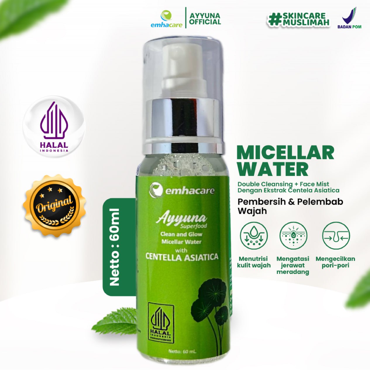 Wajah bersih serta ternutrisi maksimal. Praktis cukup dengan 1 Produk Micellar Water + Face Mist Dengan Kandungan Superfood Pertama Di Indonesia yang sudah pasti Aman, Alami, Halal dan sudah bersertifikasi BPOM Ayyuna Superfood 2 in 1 Micellar Water + Face Mist Selain dapat menghapus sisa make up, membantu mengecilkan pori pori dan mengontrol PH kulit. Juga dapat digunakan sebagai face mist untuk menutrisi kulit wajah secara maksimal.