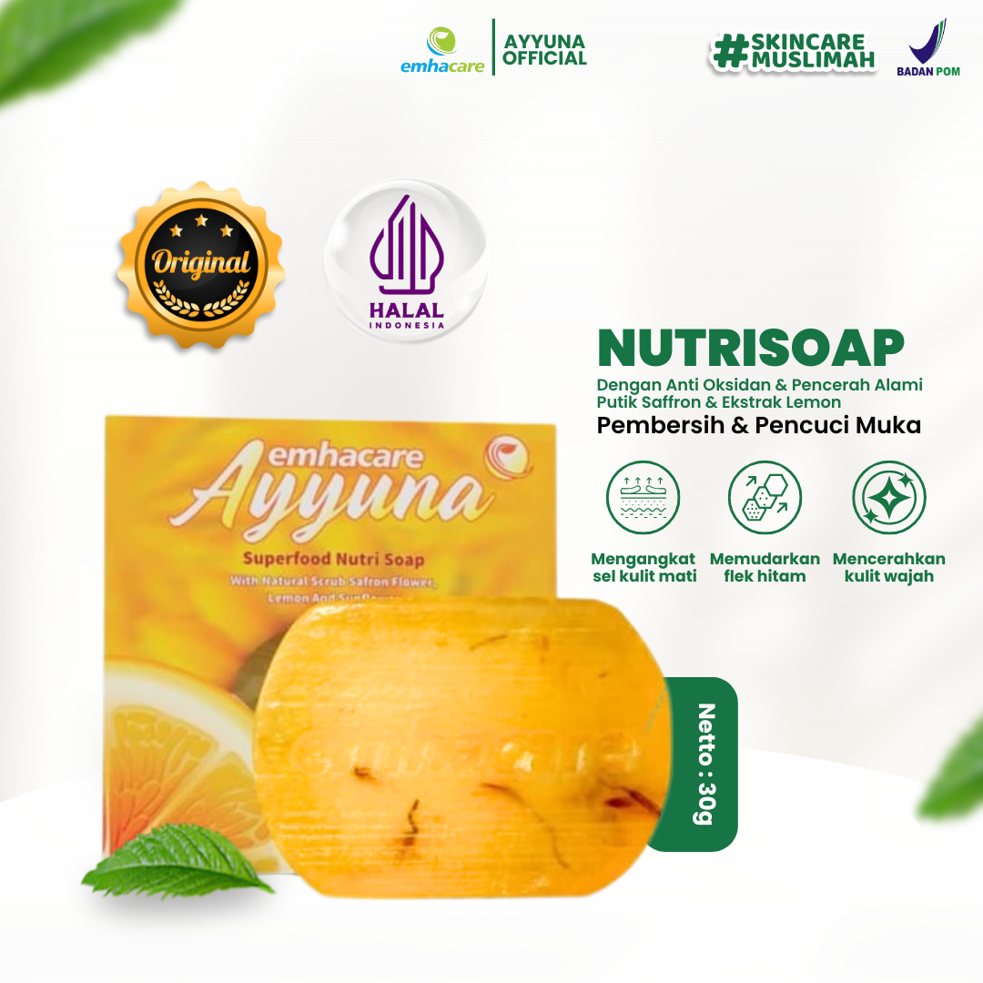 Emhacare Ayyuna Superfood Nutri soap merupakan formulasi sabun wajah berbahan superfood untuk membersihkan sekaligus menjaga nutrisi kulit. Varian sabun ini mengandung superfood lemon & bahan-bahan herbal pilihan. Diproses tanpa alkohol & tanpa parfum untuk menjaga varian ini lebih natural. Hadirnya bunga asli saffron ini berfungsi sebagai scrub organik. Bermanfaat dalam membersihkan, mencegah pigmentasi kulit, & mencerahkan. Formulasi lembut untuk berbagai jenis kulit & kulit sensitif sekalipun.